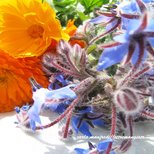 fiori da portare alla merenda cena. ho raccolto calendule e borragine a volontà. tra le erbe del campo si vedeva qualche