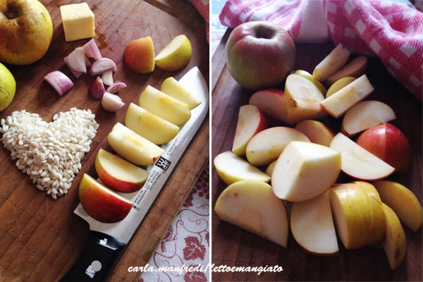 ebbene si! questa è la ricetta originale del risotto fatto con la mela tentatrice :-) si perché la Mela Rosa dei Monti Sibillini è...così è!! quando la vedi ti viene voglia di morderla per sentirne il suo sapore, la sua succosità e la sua croccantezza! e più il tempo passa e più diventa colorata assumendo delle tonalità e delle striature più intense. la ricetta è della Signora Ionni Lia che abita nel Comune di Comunanza in Provincia di Ascoli Piceno e mi è arrivata via mail dal fiduciario della Slow Food Condotta del Piceno-Nelson Gentili. Signora Lia, non sa quanto mi rende felice, la ringrazio infinitamente per la sua cortesia e generosità. donare una ricetta antica è un gesto nobile. chissà da quanti anni questa ricetta si tramanda nella sua famiglia e chissà con quale cura è stata custodita. una volta si scriveva a mano su un foglio, oggi basta digitare dei tasti di un PC e scriverli su un file per poi inviarla con un semplice click! come semplice e delicato è questo risotto. mi ha subito ricordato il riso al latte (comfort food pieno di affetto per me) ma con l'aggiunta di queste piccole fettine di mela (chiamato personalmente frutto del desiderio) tagliate poi in piccoli pezzetti, diventa un primo piatto molto appetibile e profumatissimo.